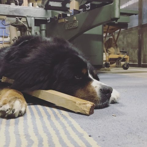 珍しく出勤フルール。ほうきで掃除したストーブ前の一等地を準備して、大役・木ぃカジカジもそこそこに、退屈がお。それでもいてくれるだけでなんか工房内がいい感じ〜◎