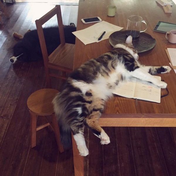 フルちゃんは足元にどてーんと定位置。スケジュール帳とメジャーを下敷きに寝るディリやん。キャッタンドッグ、会議の参加の仕方〜。足宙に浮いてますけど。