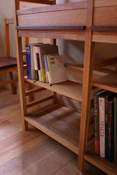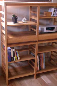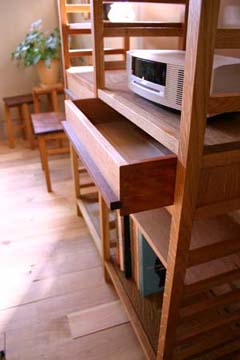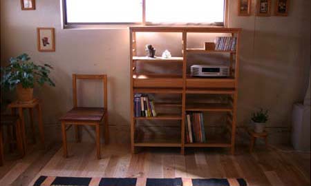 「本がたくさん入る本棚が欲しい」というご依頼をいただきました。 真ん中に引き出しのあるデザインにすることで、面白さのある本棚に仕上がりました。 それに、本棚が上下の2スペースに分かれたような印象も与えますし、 使い方も、より幅広くなるのではないでしょうか。 様々なサイズの本もきれいに仕舞えるように‥‥棚にも工夫をしてあります。