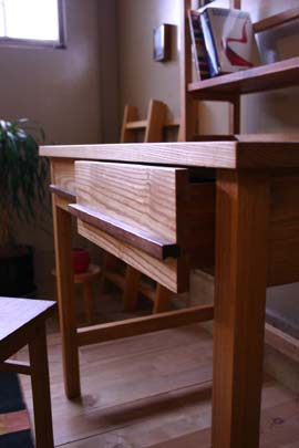じつは、ふたつの引出しの前板の木目がつながっています。 | |