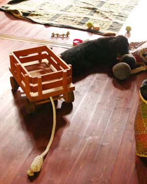 ミルクを運んだりするのが、バーニーズ・マウンテンドッグのお仕事です。 フルールが大きくなったら薪集めを手伝ってくれないかなぁ・・・ そんな密かな私たちの望みが叶うよう、フルールにプレゼントしました。 まずは、小さいうちから"荷車"に慣れるところから。 いつも、彼女のおもちゃを入れて部屋の片隅に置いています。 時々紐にじゃれついて、ワゴンを動かして遊んでいます。(しめしめ) タイヤが付いているのは見た目にも可愛いですが、 掃除の時など、いつでもゴロゴロと動かせて結構べんりです。