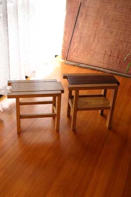 【左写真・左側】オリジナルの高さは35cm。 今回は、5cm高い40cmになっています。 座面の木は、手前が「ブラック・ウォールナット」奥は「タモ」 やはり色味の違う木が並ぶと、とても綺麗です。