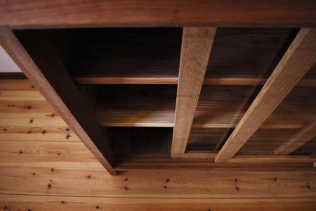 天板にはテーブルよりも厚みをもたせて、 パンやうどんをこねたり、ハードな作業にもどっしりかまえてくれます。 頼りになる、キッチン作業台 兼 食器棚。