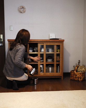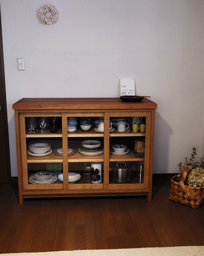 開放スペースが広くて、使いやすい三枚戸。 また、手前に開けるためのスペースもいらない引き戸は 慌ただしい台所仕事の時でも、スムーズな出し入れが魅力です。