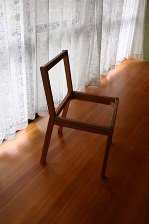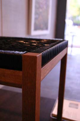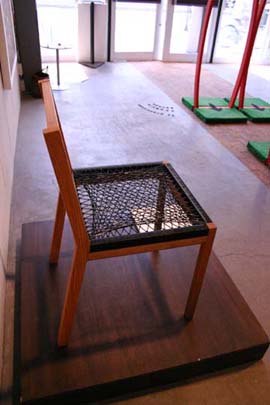 私達は木組みのみの製作で、座面はご本人が張られました。 納品してから1ヶ月後、実物を拝見できる機会があり、会場へ足を運びました。 綺麗に張られた黒色の座面は、椅子と良く合っていて格好良く、 立ち姿は凛としていて、非常に嬉しかったです。