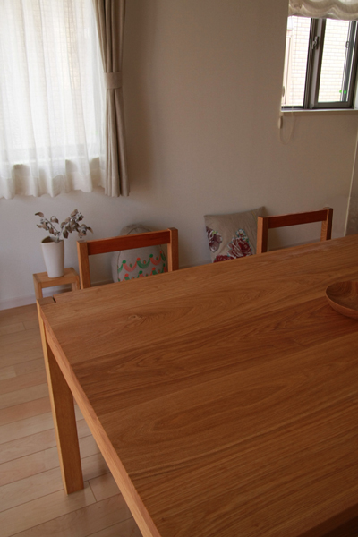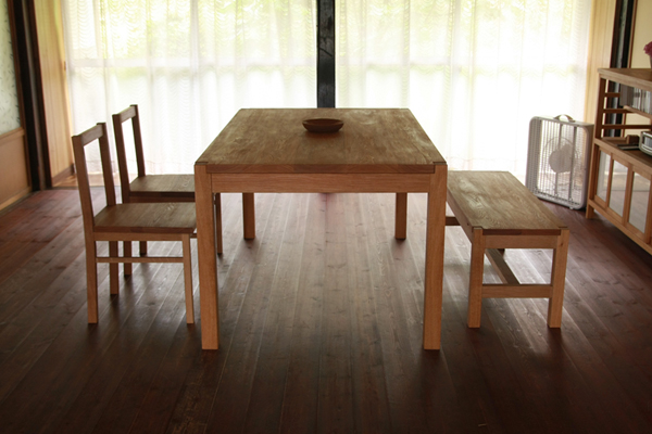 テーブル、チェアー、ベンチのセット、 背もたれのないベンチは空間を広く見せます。 テーブルのサイズは、87cm×1M45cm。 90cm×1M50cmの四角のバランス感を気に入っておられたので、 そのままのバランスで一回り小さいサイズに決まりました。 こぢんまりしていますが、6人でも充分お使いいただけるサイズです。