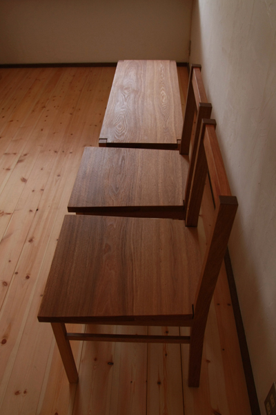 チェアーとベンチの座面は、長ーい板からできています。 綺麗に木目が繋がっているのは、気持ちの良いものです。 べンチのサイズは、横幅1m05cm×奥行36cm×高さ40cm、 こどもなら3人、大人ならゆったり二人腰掛けることができます。