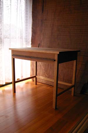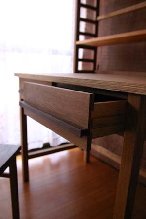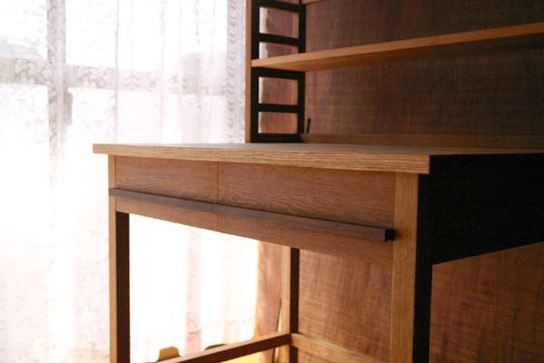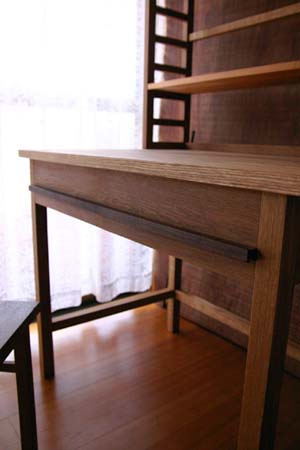 ご家族みなさんがとても気に入ってくださっていたので、 デザインは"あかねちゃんの机"と同じように製作させていただきました。 違うところは木の種類。"タモ"から、少し固めの"ナラ"に変わりました。 男の子らしく、カッコイイ・シャープな仕上がりになりました。 そして目に見えない構造部分・木の組み合わせ方も、少し進化しました。