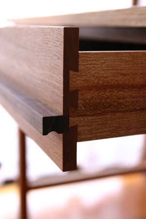 隣り合う二つの抽斗の前板と、 "つまみ"部分の木の木目は、 もちろんつながっています。 つまみやすくて頑丈な、 つみ木・お決まりの抽斗です。