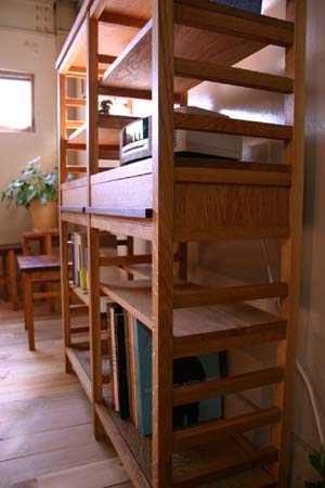 「本がたくさん入る本棚が欲しい」というご依頼をいただきました。 真ん中に引き出しのあるデザインにすることで、面白さのある本棚に仕上がりました。 それに、本棚が上下の2スペースに分かれたような印象も与えますし、 使い方も、より幅広くなるのではないでしょうか。 様々なサイズの本もきれいに仕舞えるように‥‥棚にも工夫をしてあります。