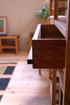 もちろん引き出しは、アリ組みで作ってあります。 デザインも使い勝手も良い、最近のお気に入りの取っ手をつけて‥‥。