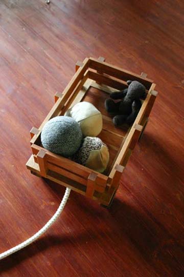 ミルクを運んだりするのが、バーニーズ・マウンテンドッグのお仕事です。 フルールが大きくなったら薪集めを手伝ってくれないかなぁ・・・ そんな密かな私たちの望みが叶うよう、フルールにプレゼントしました。 まずは、小さいうちから"荷車"に慣れるところから。 いつも、彼女のおもちゃを入れて部屋の片隅に置いています。 時々紐にじゃれついて、ワゴンを動かして遊んでいます。(しめしめ) タイヤが付いているのは見た目にも可愛いですが、 掃除の時など、いつでもゴロゴロと動かせて結構べんりです。