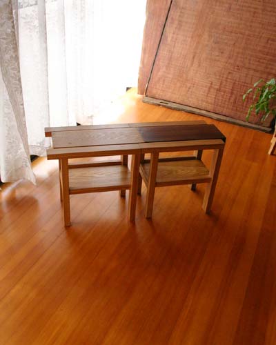 【左写真・左側】オリジナルの高さは35cm。 今回は、5cm高い40cmになっています。 座面の木は、手前が「ブラック・ウォールナット」奥は「タモ」 やはり色味の違う木が並ぶと、とても綺麗です。
