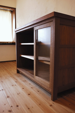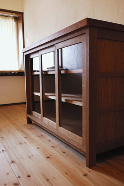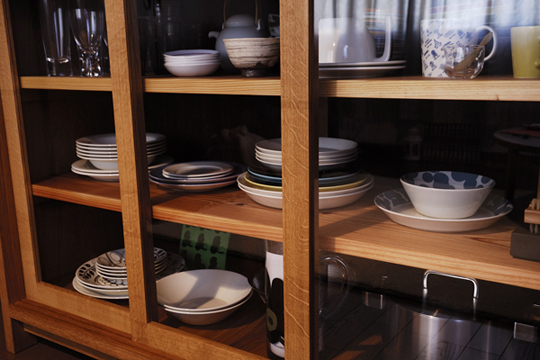 天板にはテーブルよりも厚みをもたせて、 パンやうどんをこねたり、ハードな作業にもどっしりかまえてくれます。 頼りになる、キッチン作業台 兼 食器棚。