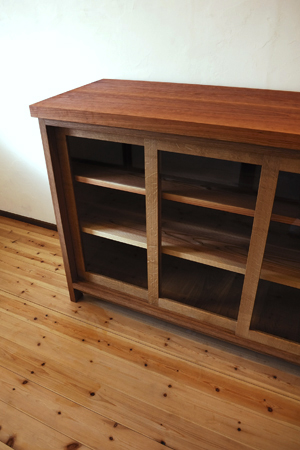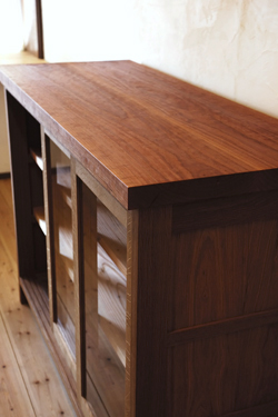 天板は「チェリー」の木。 木目が細かく水気にも強いので、 キッチンまわりに向いていると思います。