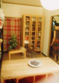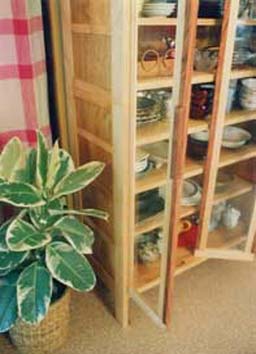 「引き出しもなく、棚のみのシンプルな食器棚が欲しい。」と、 御注文をお受けしました。 しかし、ただ開くのではもの足りない。そう思い、考えました。 少しわかり難いですが、こう開きます。  ̄ ̄ ̄ →  ̄\/ → | ‖ 金具を使わず、木のみでここまで作れたことが、 とても自信になりました。