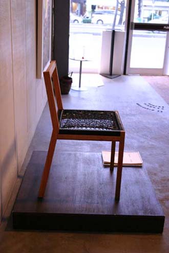 私達は木組みのみの製作で、座面はご本人が張られました。 納品してから1ヶ月後、実物を拝見できる機会があり、会場へ足を運びました。 綺麗に張られた黒色の座面は、椅子と良く合っていて格好良く、 立ち姿は凛としていて、非常に嬉しかったです。
