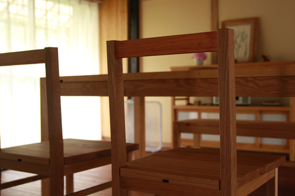 いそべ家のplain-chairの"笠木"(背が当たる部分)は、 赤みのかかったチェリーの木になっています。 このワンポイントはご夫婦からのご提案。 いつものチェアーより、ほんのり可愛らしい印象を与える、 不思議なチェリーの笠木。
