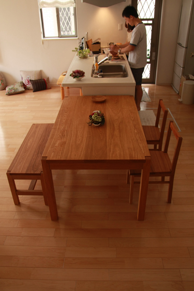 テーブル、チェアー、ベンチのセット、 背もたれのないベンチは空間を広く見せます。 テーブルのサイズは、87cm×1M45cm。 90cm×1M50cmの四角のバランス感を気に入っておられたので、 そのままのバランスで一回り小さいサイズに決まりました。 こぢんまりしていますが、6人でも充分お使いいただけるサイズです。