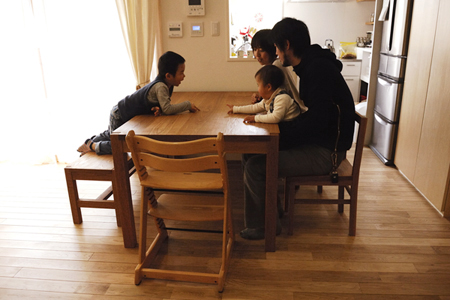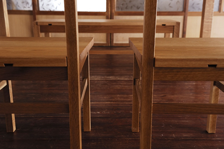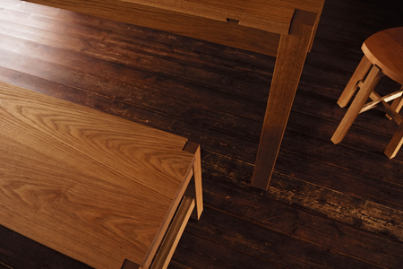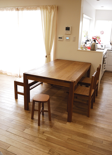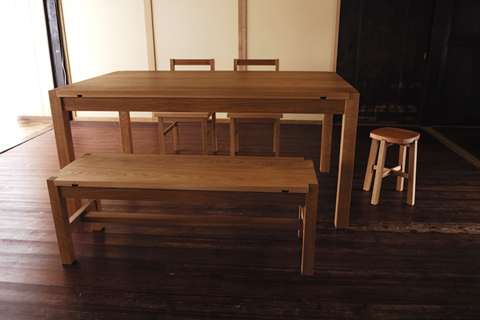 テーブル・チェアー・ベンチともに、天板は"タモ"の木。 |