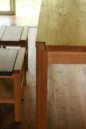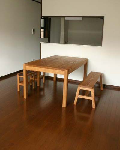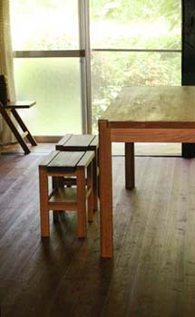 天板は「タモ」の木、素朴で当たりのやわらかい木です。 ちなみに、ベンチ側のテーブル天板とベンチの座面、元々は同じ木です。 上手く寸法がとれたので、合わせて製作してみました。 きっと、3兄弟が "ガシガシ" 使って、 かっこいいテーブルにしてくれると思います。