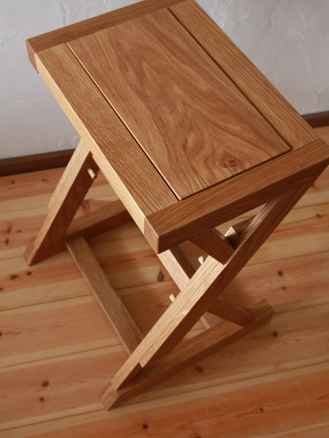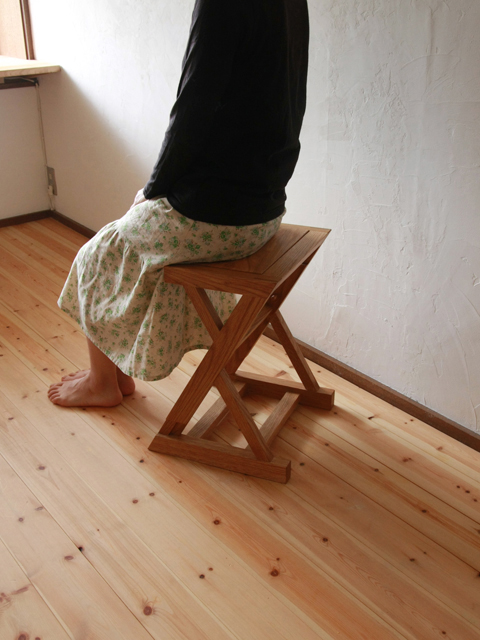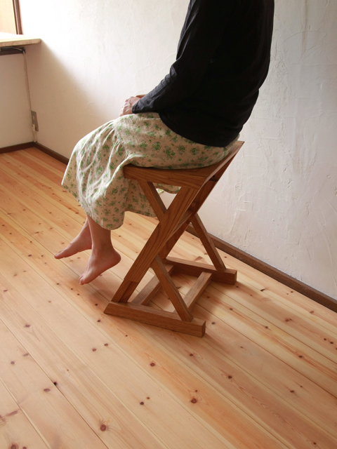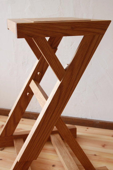 高さを変えられるスツール。上と下の構造がスライドすることで、高さを変えます。固定は、木のピンを差し込んで。
