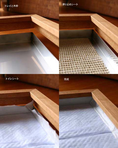 素朴な木のフレームと美しいステンレストレー、お部屋の雰囲気を損なわない、木のトイレトレーです。 シートよりもトレーを小さく製作していますので、シートの端が側面に立ち上がり漏れを防ぎます。また、ステンレスは清潔感があり、適度な重さと安定感があるのも良いです。